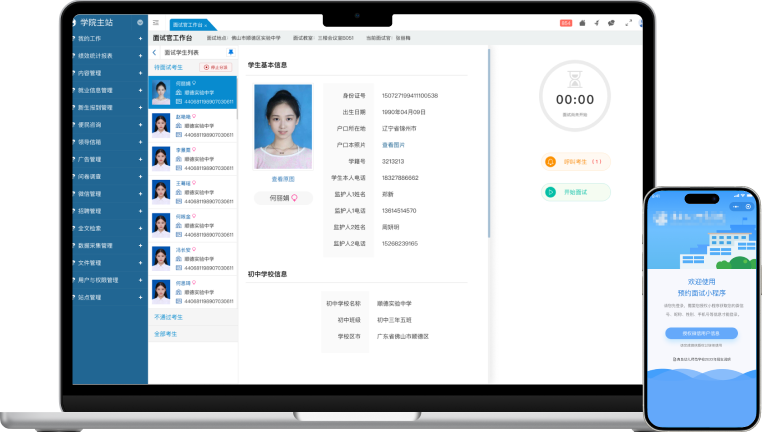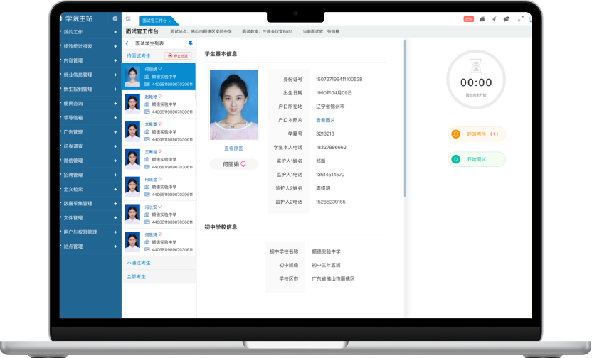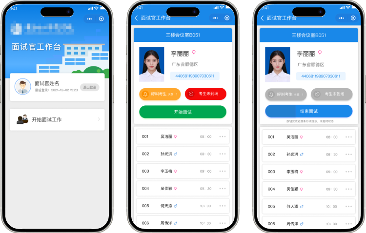 面試官工作臺支持叫號、考生未到場處理、開始面試、結(jié)束面試、錄入面試結(jié)果等操作,并提供倒計時及超時提醒功能。