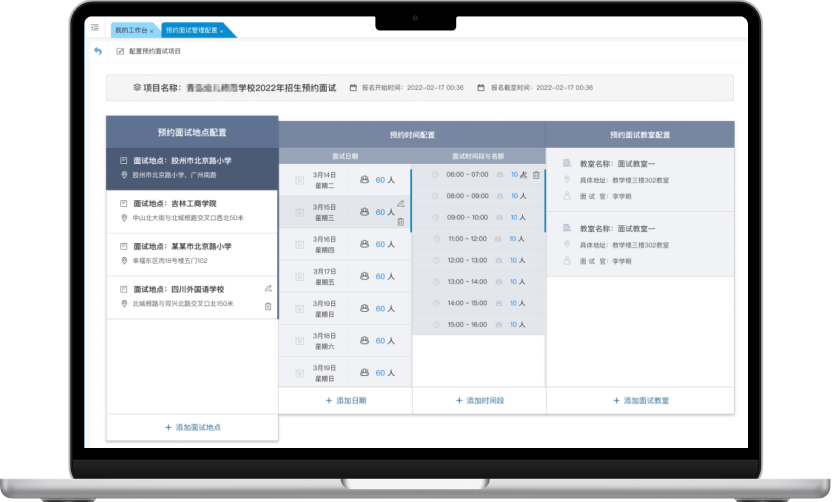 可配置每位考生的面試時長,并設(shè)定面試項目的地點、日期、時間段、面試教室和面試官等參數(shù)。