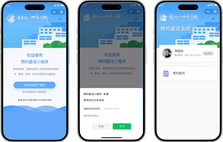 學校通過網(wǎng)站、微信公眾號、微信群等方式發(fā)布招生簡章,學生及家長收到通知后,可掃描二維碼進入小程序。小程序自動獲取當前微信綁定的手機號進行注冊和登錄。成功登錄后,進入招生面試管理系統(tǒng)小程序的主頁。