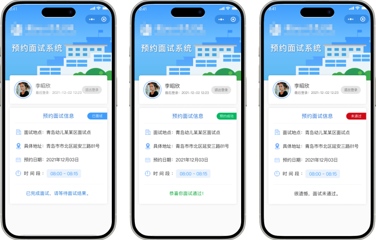 系統(tǒng)在預約面試日期前三天、前一天、預約當天,以及預約時間段的前3小時,分別發(fā)送提醒通知,確??忌磿r到達面試現(xiàn)場。