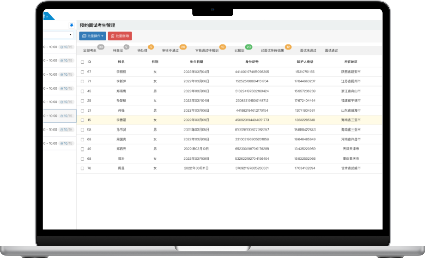 報名表狀態(tài)包括:全部、待查閱、已查閱、審核未通過、審核通過待報到、已報到、面試中、已面試、考生缺考、面試未通過、面試通過等。