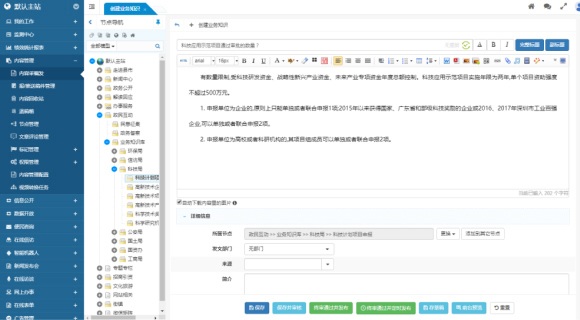 業(yè)務(wù)知識庫是在內(nèi)容管理系統(tǒng)的基礎(chǔ)上深度開發(fā)而成,作為內(nèi)容模型的一部分,業(yè)務(wù)知識庫的分類管理已整合在節(jié)點(diǎn)管理模塊中,業(yè)務(wù)知識管理則集成于內(nèi)容采編發(fā)模塊。這種深度整合使得業(yè)務(wù)知識庫能夠充分利用內(nèi)容管理系統(tǒng)的各項(xiàng)強(qiáng)大功能,如節(jié)點(diǎn)權(quán)限控制、報(bào)送/推送、錯別字檢查,敏感信息檢查、全文檢索,智能問答,頁面輸出緩存等,大大提升了系統(tǒng)的功能性和使用效率。
