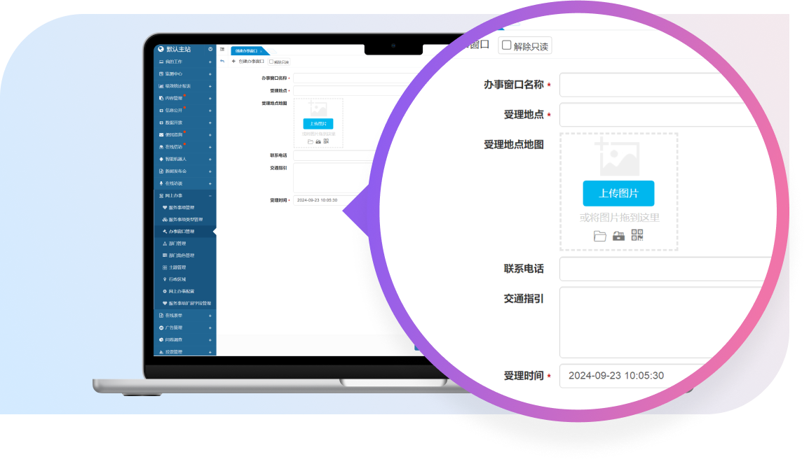 支持創(chuàng)建新辦事窗口、對現(xiàn)有辦事窗口進(jìn)行修改、查看、刪除、以及搜索與篩選功能,確保管理人員能夠輕松應(yīng)對窗口管理的各項任務(wù)。