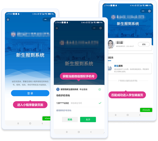 新生報(bào)到的學(xué)生端通過微信小程序?qū)崿F(xiàn)。學(xué)生到校后,掃描學(xué)校公布的小程序二維碼,進(jìn)入小程序。小程序會(huì)自動(dòng)獲取當(dāng)前微信綁定的手機(jī)號(hào),并與新生報(bào)到數(shù)據(jù)進(jìn)行匹配。