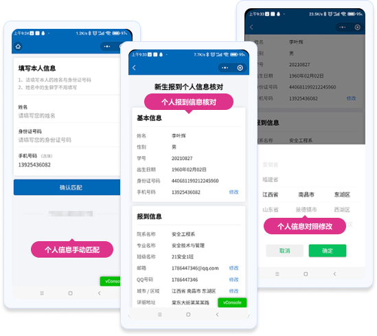 如果手機(jī)號(hào)未能與系統(tǒng)中的新生數(shù)據(jù)匹配,系統(tǒng)將提示學(xué)生在小程序頁(yè)面中填寫【姓名+身份證號(hào)+原手機(jī)號(hào)】進(jìn)行數(shù)據(jù)匹配。匹配成功后,進(jìn)入個(gè)人信息核對(duì)步驟。