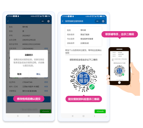 如果匹配成功,系統(tǒng)將顯示學(xué)生的院系、專業(yè)、班級(jí)、個(gè)人信息等內(nèi)容。新生需核對(duì)個(gè)人信息,如有誤,可以根據(jù)實(shí)際情況進(jìn)行修改,并提交更改。系統(tǒng)會(huì)彈出確認(rèn)信息窗口,點(diǎn)擊【確認(rèn)提交】按鈕后,系統(tǒng)會(huì)根據(jù)學(xué)生的身份證和當(dāng)前時(shí)間生成一個(gè)二維碼。