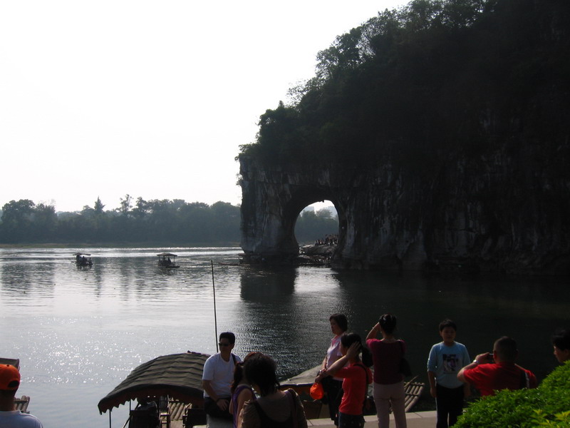 走了不久就見到象鼻山了,還真不減當年的氣勢。由于游人很多,要照到一張沒有人山合影的還真難呢?這里的游人還有不少的外國朋友,我注意到他們大部分跟我們這幾個小伙子一樣自助游噢!漓江的水現(xiàn)在還是清澈見底的,不是很寬也不是很深,站在旁邊看比較淺的地方還能看到水草和鵝卵石。江邊還挺靠著很多竹排和小船還有游船。也有江邊燒烤漓江小魚的,在強烈的陽光下,時而吹來了微風夾著淡淡的魚香味直讓人不斷咽口水。大概是怕上火很多游人包括我也沒敢去嘗試,不過還是有去試的。還時不時的聽到一些旅游團的導游用喇叭給游客們講解。靜聽了一會就離開了,不遠處有雜技表演。手拋多個羽毛球拍、小球,還有嘴叼筷子頂氣球及變臉等等。我們先到處轉了轉,照些相片最后決定到象鼻山的象鼻子下站一站。這有水路和陸路都可以到達,暈,一問水路的竹排20元,就幾米嘛!所以我們就馬上打算另尋小路過去,跟著其他游人最后還是到達了我們想去的地方。還爬了象鼻山,這時總算把整個象鼻山公園給游遍了。要不是有這依舊秀美的漓江水和高大的像鼻山,大老遠跑來看公園真會讓人失望的。還照了些相片就離開象鼻山了。