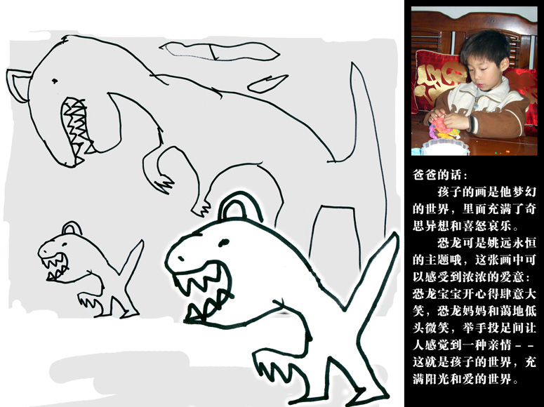 在童年時(shí),孩子的畫就與他的語言一樣重要,通過涂鴉表現(xiàn)補(bǔ)充自己語言上的不足,所以畫是孩子的童話世界:)我家周圍有個(gè)中華恐龍園(),占地600畝,一進(jìn)園有個(gè)大草地,里面有一群很大的飛奔鐵恐龍雕塑(很逼真,兒子小時(shí)候都不敢去摸它們)。20000平方米的中華恐龍館中都是恐龍的世界,所以在他心中,恐龍是離他最遠(yuǎn)又最近的動(dòng)物。
