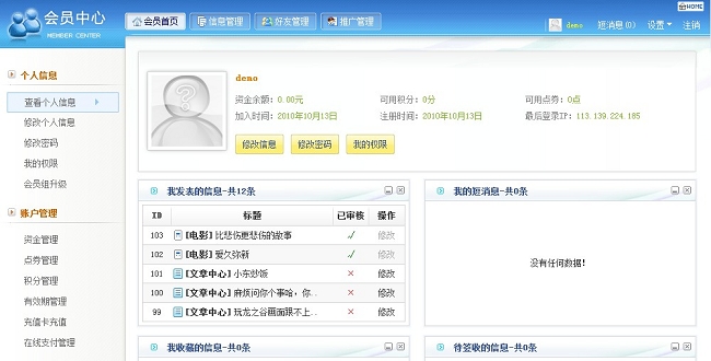 重構(gòu)的會員中心使用全新的布局,左側(cè)為個人信息區(qū)域、頂部為功能導航區(qū)、右側(cè)為操作區(qū)域。會員中心跟主頁一樣均使用模塊化、CSS化,方便設(shè)計師可以更好的對其控制。簡單來說,模塊化即頁面的每部分都是獨立互不影響,用戶可以根據(jù)網(wǎng)站的要求對模塊進行添加或刪除;CSS化即去除了主題,將頁面中控件的所有樣式都提取出來,統(tǒng)一使用CSS控制,當會員中心風格需要改變的時候,只需要修改CSS文件即可達到牽一發(fā)動全身的效果。