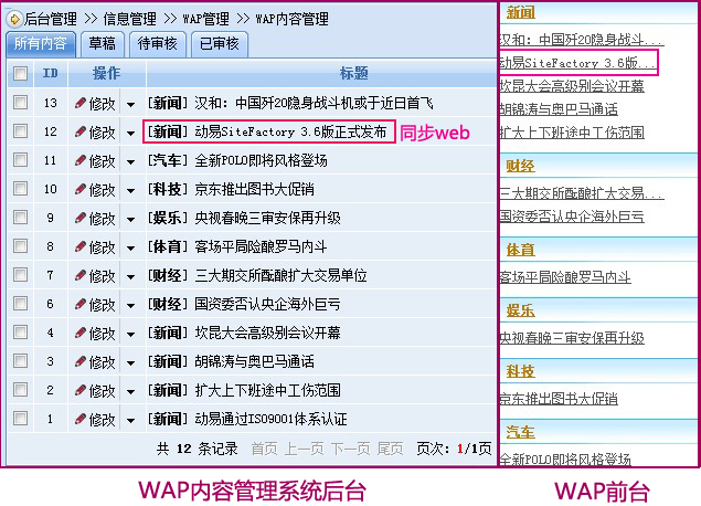 ?。?nbsp;WAP內(nèi)容可控:可單獨進(jìn)行添加、刪除等管理,也可手動同步Web內(nèi)容(獲取內(nèi)容模型中的信息即可);