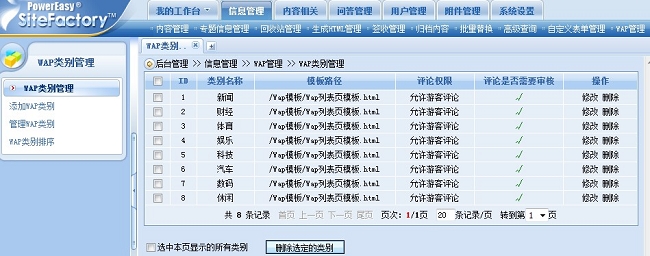 動易WAP管理系統(tǒng)的類別可以自由添加、修改、刪除以及排序,在這里您還可以單獨設(shè)置某個類別是否支持評論。