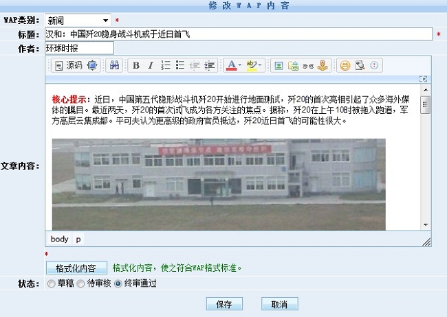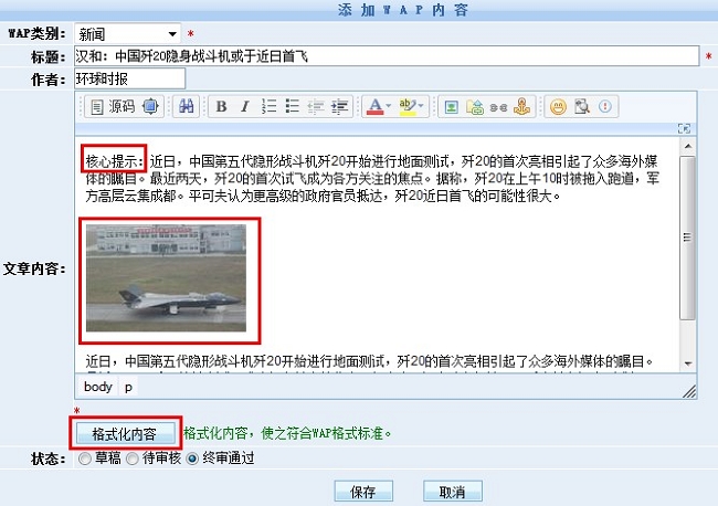 然而,在經(jīng)過簡單的設(shè)置后,只需一個按鈕即可很好的解決這兩個問題。在下圖中可以看到,在“RSS/WAP參數(shù)配置”里設(shè)好生成WAP圖片的參數(shù)后,點擊“格式化內(nèi)容”按鈕,圖片即會與文字格式一起發(fā)生變化。