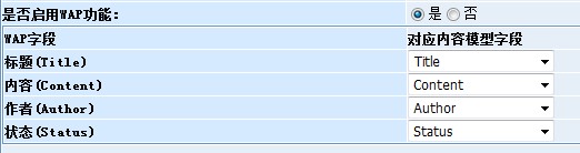 要在某個內(nèi)容模型上同步WAP的內(nèi)容,需要在內(nèi)容模型里開啟WAP功能。如有特別需要的用戶,可設(shè)置WAP字段對應(yīng)的內(nèi)容模型字段。