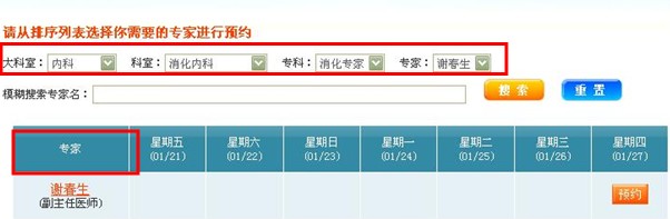 經(jīng)過上一步的操作,我們現(xiàn)在已經(jīng)進(jìn)入預(yù)約頁面了,大家可以在下面的截圖中看到,頁面呈現(xiàn)出了科室、專家的排班時間、是否可預(yù)約等信息,我們可以進(jìn)行仔細(xì)的查看,根據(jù)頁面提供的信息確定我們需要預(yù)約的專家情況。
