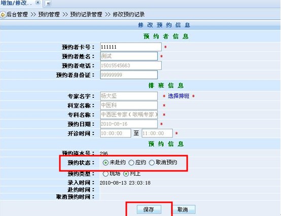 進(jìn)入修改頁面后可以看到系統(tǒng)會呈現(xiàn)出我們所需要的全面預(yù)約信息,我們只要將“預(yù)約狀態(tài)”修改為相應(yīng)狀態(tài),然后點擊“保存”就可以了。