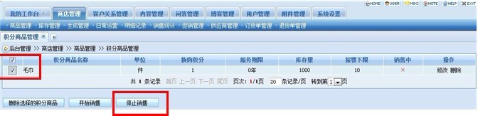 接下來(lái),在積分商品管理中我們可以看到商品信息的最下方有積分商品管理的操作鍵:“開始銷售”和“停止銷售”,勾選商品前面的小方框后,單擊“停止銷售”便可停止積分商品的銷售功能。
