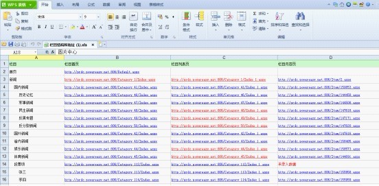 導(dǎo)出的Excel文件的示例如下圖所示,紅色部分為指定的模板文件不存在或欄目?jī)?nèi)未添加任何內(nèi)容。這樣,設(shè)計(jì)人員和網(wǎng)站管理人員就可以方便的點(diǎn)擊文件中的鏈接直接查看前臺(tái)網(wǎng)頁(yè)的內(nèi)容了。