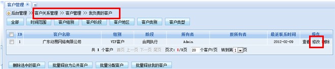 首先,進入首先進入系統(tǒng)后臺“客戶關系管理”界面,在“我的客戶”中點擊“修改”功能按鈕。