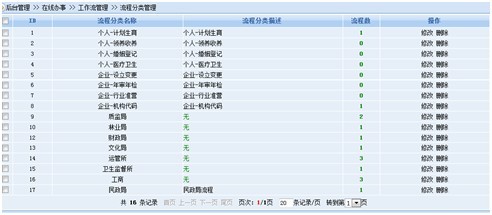 系統(tǒng)提供辦事分類(lèi)管理功能,能夠添加辦事分類(lèi),可設(shè)置辦事分類(lèi)名稱(chēng)、辦事指南模板、流程指示模板、文檔下載模板、網(wǎng)上申報(bào)模板、常見(jiàn)問(wèn)題模板、咨詢建議模板等,也可以對(duì)辦事分類(lèi)進(jìn)行修改和刪除等。