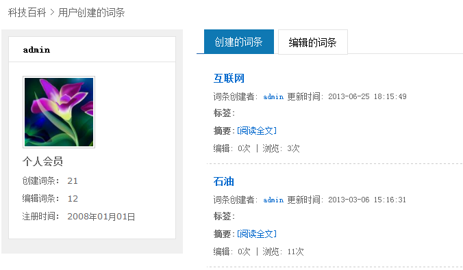 為了方便注冊(cè)用戶對(duì)自己創(chuàng)建的詞條、編輯的詞條等信息進(jìn)行統(tǒng)一管理,系統(tǒng)設(shè)置了“用戶創(chuàng)建的詞條”頁面,點(diǎn)擊用戶頭像,即可進(jìn)入“用戶創(chuàng)建的詞條”頁面。注冊(cè)用戶可以在這里對(duì)自己的創(chuàng)建的或參與編輯的詞條等進(jìn)行查看詞條。后臺(tái)管理員設(shè)置權(quán)限后,用戶還可以進(jìn)行編輯詞條、鎖定詞條、解鎖詞條、推薦詞條、刪除詞條、設(shè)置詞條分類等系列操作。
