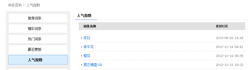 管理員可在后臺(tái)置為推薦詞條、精彩詞條、熱門詞條等。前臺(tái)會(huì)根據(jù)這些設(shè)置以及最近更新、人氣指數(shù)等等進(jìn)行排行??梢晕嗟挠脩魹g覽。