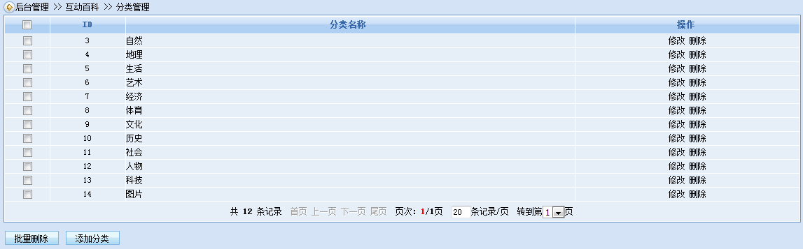 提供對(duì)詞條分類管理功能,可對(duì)詞條進(jìn)行添加、修改、刪除等操作。一個(gè)詞條可以設(shè)置多個(gè)分類。前臺(tái)用戶創(chuàng)建詞條時(shí),會(huì)根據(jù)后臺(tái)設(shè)置的詞條分類為要?jiǎng)?chuàng)建的詞條選擇一個(gè)合適的分類。