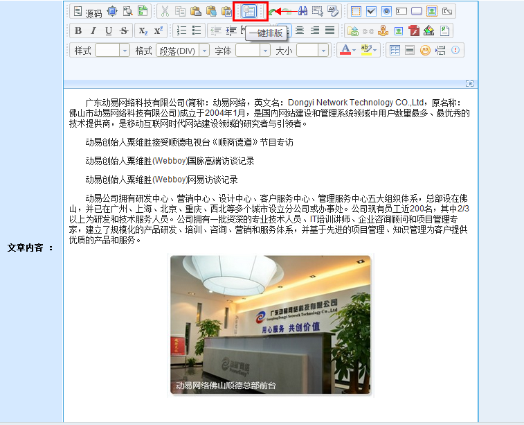 對(duì)于大多數(shù)人來(lái)說(shuō),日常編輯文章時(shí)常需要在文章的排版上消耗很多時(shí)間。如果你負(fù)責(zé)網(wǎng)站內(nèi)容更新工作則更為頭疼,每天對(duì)著N多需要對(duì)外發(fā)布的新聞,每篇新聞發(fā)布前,都得將文章排版成標(biāo)準(zhǔn)格式,費(fèi)時(shí)費(fèi)力,成為了編輯們“心中不可言喻的痛”。以往在動(dòng)易編輯器中調(diào)整文章格式時(shí),都得一項(xiàng)項(xiàng)手動(dòng)進(jìn)行,頗為費(fèi)時(shí)費(fèi)力,在動(dòng)易5.1版本中,大家利用“一鍵排版”功能將能更加輕松的進(jìn)行內(nèi)容編輯和排版工作。“一鍵排版”功能可以對(duì)文章進(jìn)行快速自動(dòng)排版功能。只需點(diǎn)擊一下按鈕,就可使之成為合乎規(guī)范和標(biāo)準(zhǔn)的文章格式。如果從word或網(wǎng)頁(yè)直接的復(fù)制粘貼文章,“一鍵排版”功能能夠?qū)Ω袷交靵y的文章進(jìn)行整理、編輯和快速排版,排版后的文章會(huì)被剔除所有的樣式,僅以段落為單位進(jìn)行排列,使文章結(jié)構(gòu)更加清晰,內(nèi)容更加干凈和整潔。