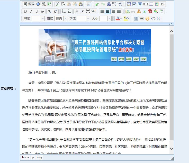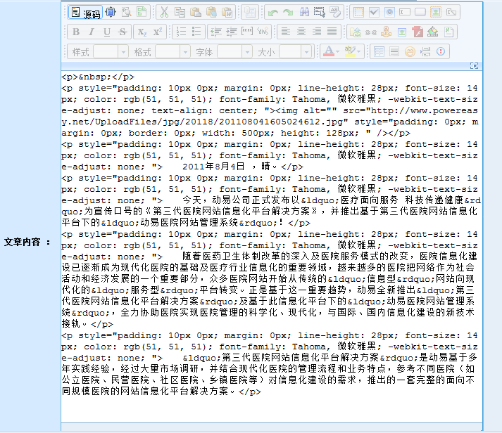 在動(dòng)易后臺(tái),進(jìn)入“添加文章頁(yè)面”,在編輯器中輸入文字,添加圖片后,此時(shí)文章無(wú)格式: