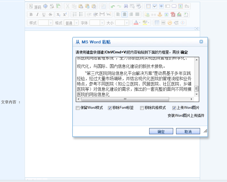 在動(dòng)易后臺(tái),進(jìn)入“添加文章頁(yè)面”,在編輯器中從MS Word粘貼剛復(fù)制的文章: