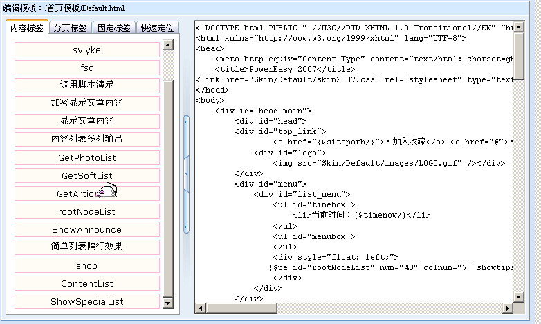 06版本的模板編輯,使用了可視化的在線編輯器,通過右鍵的快捷方式,可以快速的編輯和修改模板和標簽代碼,但這種編輯器有一個重大的弱點,就是不夠規(guī)范,它經(jīng)常會自作主張的修改用戶輸入的源代碼,使其不能符合用戶的要求,舉個簡單的小例子: