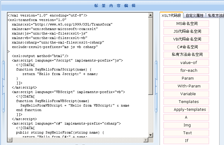 動易 SiteFactory :標簽模板可以使用C#,VB, JavaScript和標準的XSLT語句,對數(shù)據(jù)進行處理輸出,下圖中就是同時在標簽編輯器里使用三種不同程序語言的示例: