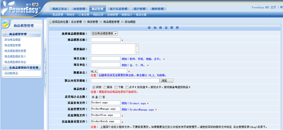 動易eShop2007的商品添加采用了這樣的步驟:1、添加商品模型;2、添加商品節(jié)點與欄目;3、添加商品。商品模型的定義是商品上架的首要一步:商店管理——商店設(shè)置——商品模型管理——添加商品模型。