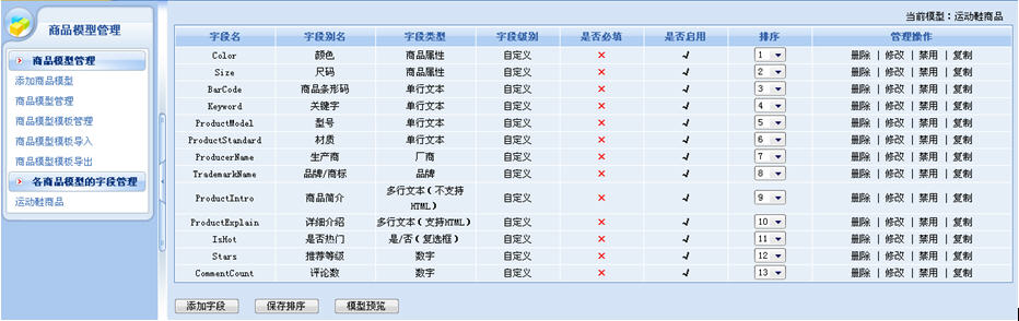 這里主要是定義商品模型的名稱、數(shù)據(jù)表名、商品性質(zhì)等內(nèi)容。添加完商品模型后,我們需要為模型設(shè)計字段,也就是我們常見的為該商品模型的數(shù)據(jù)庫表設(shè)計字段:商店管理——商店設(shè)置——商品模型管理——各商品模型的字段管理。
