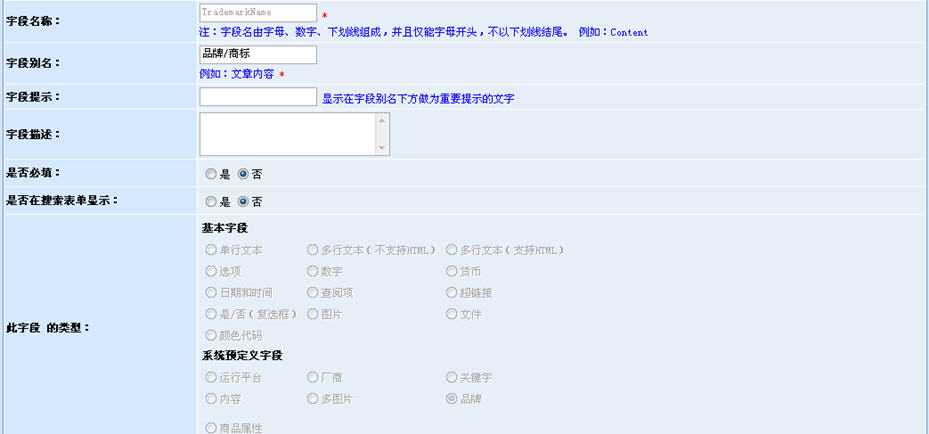 這里有字段名稱、提示、是否必填、字段類型等內(nèi)容需要我們進行定義。動易eShop2007將商品的數(shù)據(jù)庫表的修改權(quán)限完全開放了出來,以實現(xiàn)最大程度的用戶自定義,滿足不同的網(wǎng)店商品的需求。特別地,我們看到字段類型有一些“奇怪”的名詞,如:多行文本(支持HTML)、顏色代碼、圖片、超鏈接、文件等。這些并不是數(shù)據(jù)庫字段的類型,而是eShop2007內(nèi)置好的一些功能,用于在商品模型里自定義使用HTML編輯器、顏色代碼選擇器、圖片上傳、文件上傳等。也就是說,動易eShop把諸多以前固定的封裝的功能都開發(fā)出來了,實現(xiàn)了這些功能調(diào)用的自定義,極大地賦予了系統(tǒng)的自由性。