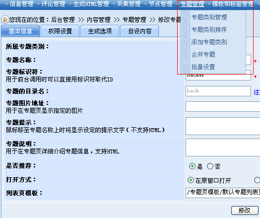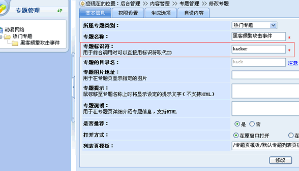 比如我們需要為近期頻繁的黑客攻擊事件進(jìn)行一個(gè)專題報(bào)道,于是進(jìn)入專題管理,建立“黑客專題”(如下圖)。特別注意圖中紅色框內(nèi)的內(nèi)容“專題標(biāo)識(shí)符”,圖中所示填寫的是“hacker”,那么如果前臺(tái)需要調(diào)用所有關(guān)于黑客的文章,只需要在調(diào)用標(biāo)簽中輸入“hacker”即可。