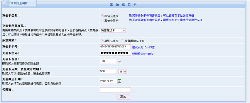 最后就是需要添加充值卡了,需要到“充值卡管理”里面添加單張充值卡或者批量生成充值卡。需要注意的是要正確選擇充值卡所屬商品,也就是所生成的充值卡要對(duì)應(yīng)屬于上面所添加的充值卡商品,否則充值卡將無法正常出售。另外“充值卡點(diǎn)數(shù)、資金或有效期”也要注意要與所屬商品中所描述的點(diǎn)數(shù)相同。