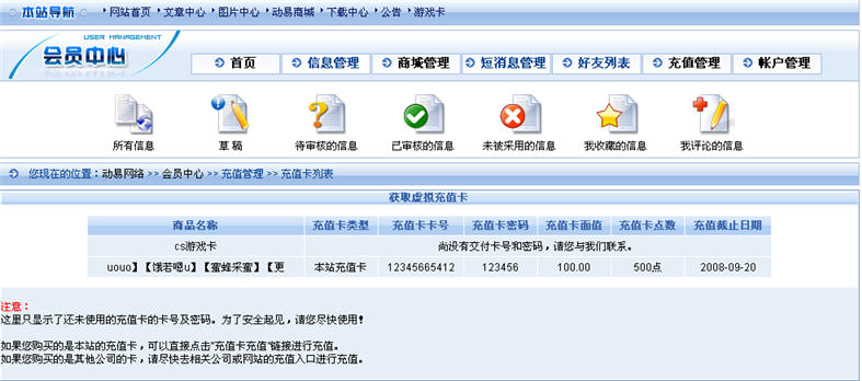 好了,以上步驟全部完成后,充值卡就可以在前臺(tái)商城中出售了,客戶可以像購(gòu)買其他商品一樣購(gòu)買充值卡,而且動(dòng)易eShop2007還具備自動(dòng)交付充值卡的功能。客戶在支付完畢貨款后,管理員在后臺(tái)訂單管理頁(yè)面可以直接點(diǎn)擊“交付充值卡”來發(fā)貨,隨后客戶即可在前臺(tái)會(huì)員中心里直接提取到充值卡卡號(hào)和密碼。