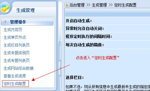 首先進(jìn)入生成管理,在左側(cè)可以看到“定時生成配置”按鈕: