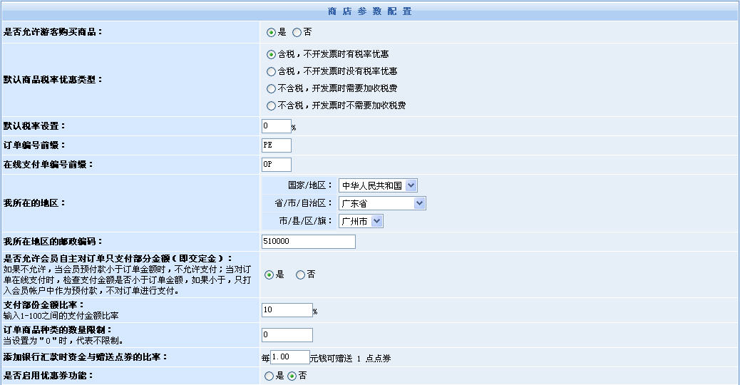 圖1。這是商店參數(shù)配置的一部分截圖,在這部分里,主要配置了商店的一些常用功能選項的開關與參數(shù),比如:含稅、部分支付訂單、區(qū)域、郵編、是否啟用優(yōu)惠券、支付金額比率(每次支付不得少于商品總額的多少)……等等。