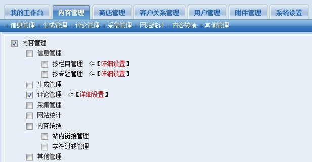 此外,樹狀目錄中的權(quán)限還配備了“詳細(xì)配置”的功能,為角色分配權(quán)限提供了更多種的配置途徑。下一節(jié)我們將以“信息管理”子模塊下的“按欄目管理”三級權(quán)限的詳細(xì)設(shè)置來進(jìn)行介紹節(jié)點(diǎn)的權(quán)限設(shè)置。
