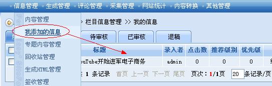 以我為例,需要經(jīng)常進(jìn)入動易官網(wǎng)后臺搜索和查詢自己之前的文章或者他人的文章,進(jìn)行對比、修改等操作。這在SiteFactory? 1.0版本中是件相對麻煩的事情,動易官網(wǎng)已經(jīng)包含數(shù)十萬級別的文章量了,其中不便可想而知。新版本的SiteFactory?加入這個功能后,自己日常工作就方便了很多,只要點擊一下,不管時間久遠(yuǎn)只要是我添加的文章都一一例舉出來了,很好!我剛剛添加了一篇文章,點擊“我添加的信息”后,顯示效果如下圖:
