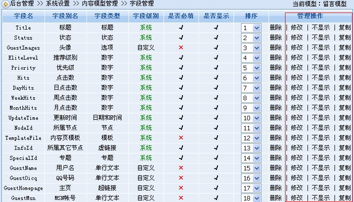 一是增加了一個(gè)“顯示/不顯示”的功能代替“啟用/禁用”功能,這樣做是為了幫助用戶對(duì)不需要顯示的系統(tǒng)字段進(jìn)行隱藏,或者對(duì)暫時(shí)不需要的字段進(jìn)行隱藏。隱藏后的字段將不會(huì)在前臺(tái)和后臺(tái)顯示出來(lái)。
