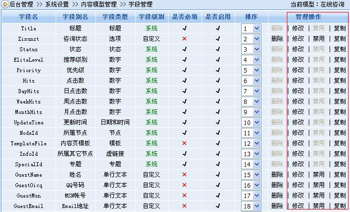 二是改良后的留言模型能夠自由增刪字段,制作成各種提交表單模型。如下圖是簡(jiǎn)單制作的“在線咨詢模型”: