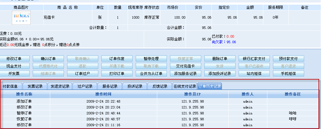 從上圖我們可以看到,在訂單處理頁面下方的“訂單歷史記錄”里,系統(tǒng)詳細記錄了該訂單每一次歷史操作記錄,包括操作名稱、操作時間、操作員IP、操作人、操作備注等等,一覽無遺。