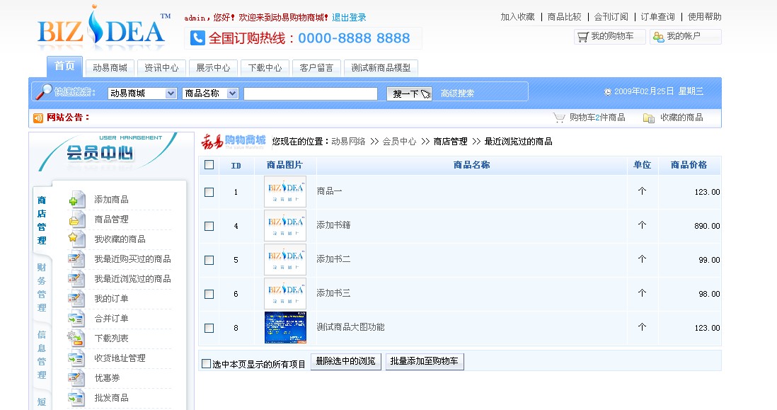 為了提高會(huì)員購物體驗(yàn),BizIdea2.5版系統(tǒng)在前臺(tái)會(huì)員中心新增了“我最近瀏覽過的商品”功能,可以對(duì)前臺(tái)會(huì)員所有的商品瀏覽歷史進(jìn)行記錄。會(huì)員可以在會(huì)員中心中查看自己曾瀏覽商品的名稱、單位及價(jià)格信息,也可直接將商品從列表中刪除或批量添加至購物車。(如圖)