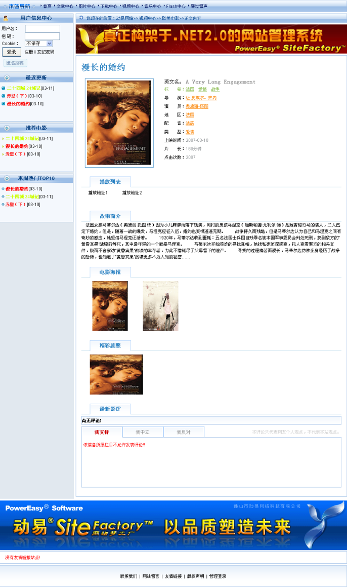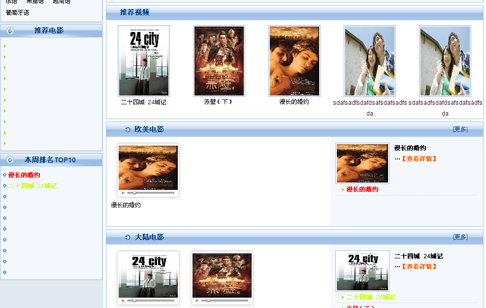 而在視頻模型專(zhuān)門(mén)配置的前臺(tái)頁(yè)面模板中,還內(nèi)置了一系列的標(biāo)簽,如分類(lèi)檢索、推薦電影、本周排名、新片速遞、推薦視頻、最新影評(píng)等等,前臺(tái)用戶可以在線觀看視頻、可以按標(biāo)簽、演員、導(dǎo)演、配音、地區(qū)、影片類(lèi)型、上映時(shí)間、片長(zhǎng)、劇情介紹、幕后等字段對(duì)站內(nèi)視頻進(jìn)行搜索,可以對(duì)視頻發(fā)表評(píng)論,還可以查看到各種視頻排行榜單。