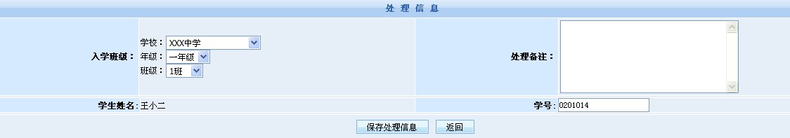 學(xué)校工作人員在后臺(tái)可以對(duì)學(xué)生的報(bào)名進(jìn)行審核處理,符合學(xué)校錄取條件的即可直接將學(xué)生分配至相應(yīng)的年級(jí)和班級(jí),同時(shí)系統(tǒng)為該學(xué)生自動(dòng)生成唯一學(xué)號(hào)。