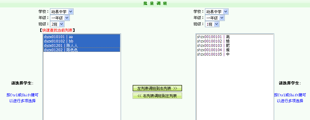 在學(xué)校中,學(xué)生可能會因為多種情況而需要調(diào)班或者轉(zhuǎn)班,為了切合這一實際需求,3.0學(xué)校版新增了給學(xué)生調(diào)班的功能,可以將學(xué)生相關(guān)信息從當(dāng)前班級轉(zhuǎn)到其他班級。此外,系統(tǒng)還提供了批量調(diào)班的功能,可以便捷地實現(xiàn)多個學(xué)生的一次性調(diào)班操作。