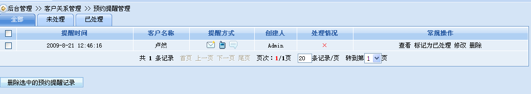 客戶關(guān)系的良好維護(hù)離不開客服人員持續(xù)不斷地定期跟客戶聯(lián)系,而如果企業(yè)客戶數(shù)量眾多,每個(gè)客服人員均需負(fù)責(zé)成百上千客戶的時(shí)候,便有可能發(fā)生不能很好地安排時(shí)間定時(shí)與每一位客戶進(jìn)行聯(lián)系,以致遺忘掉了其中某些客戶,造成客戶關(guān)系維護(hù)的中斷,最終造成客戶的流失。為了盡量避免這一情況的發(fā)生,系統(tǒng)提供了約約提醒功能,客服人員可以事先設(shè)置好與某位客戶的聯(lián)系預(yù)約信息、時(shí)間和需要提醒的方式;當(dāng)預(yù)約時(shí)間到了之后系統(tǒng)將自動(dòng)以客服人員事先設(shè)置的提醒方式提醒客服人員聯(lián)系客戶,提醒方式可以是郵件、手機(jī)短信或系統(tǒng)后臺(tái)將自動(dòng)彈出提示窗口提示。