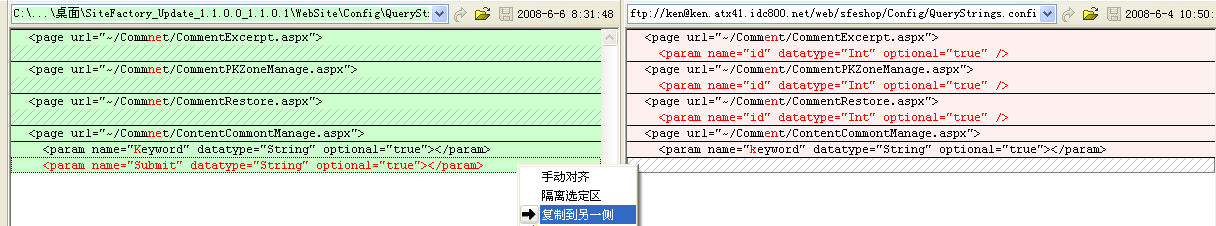 2、對紅色的差異文件QueryStrings.config,雙擊打開文件查看器,進(jìn)行逐行對比覆蓋或編輯。點(diǎn)擊“紅色的不等號”的按鈕可以只顯示有差異的代碼行。如果我們曾經(jīng)編輯過ftp里的QueryStrings.config文件,并且想保留我們增加或修改的代碼,那么我們可不對該代碼進(jìn)行覆蓋修改。